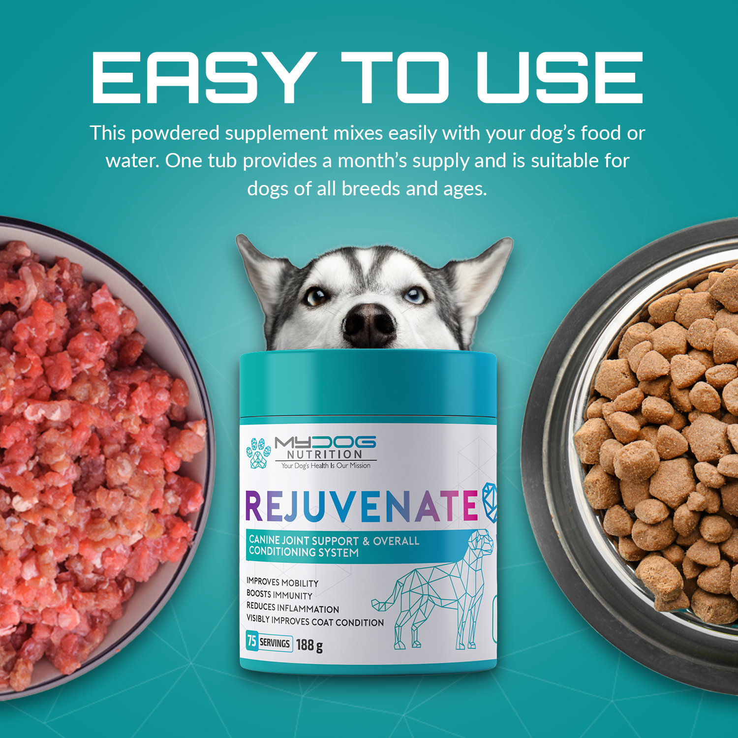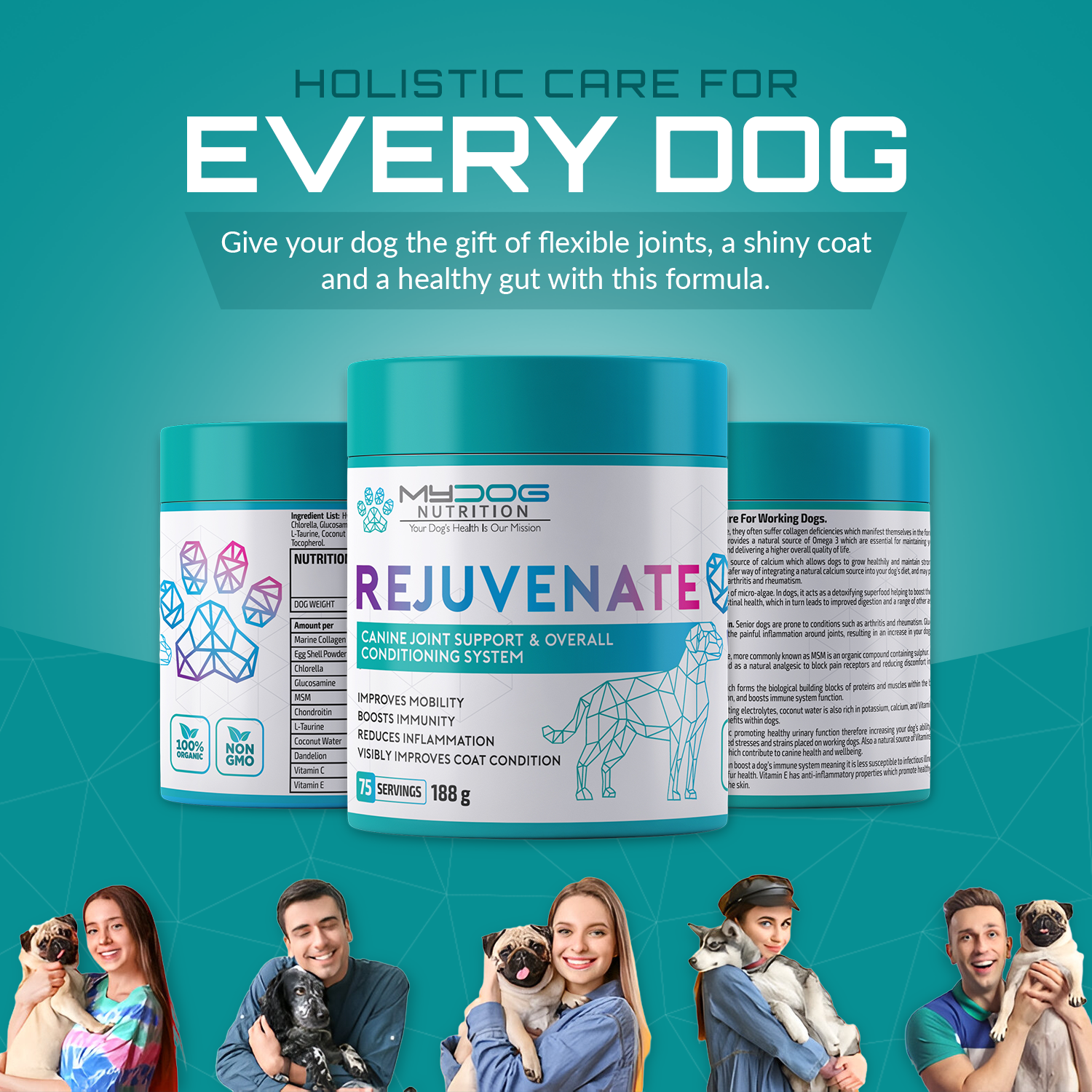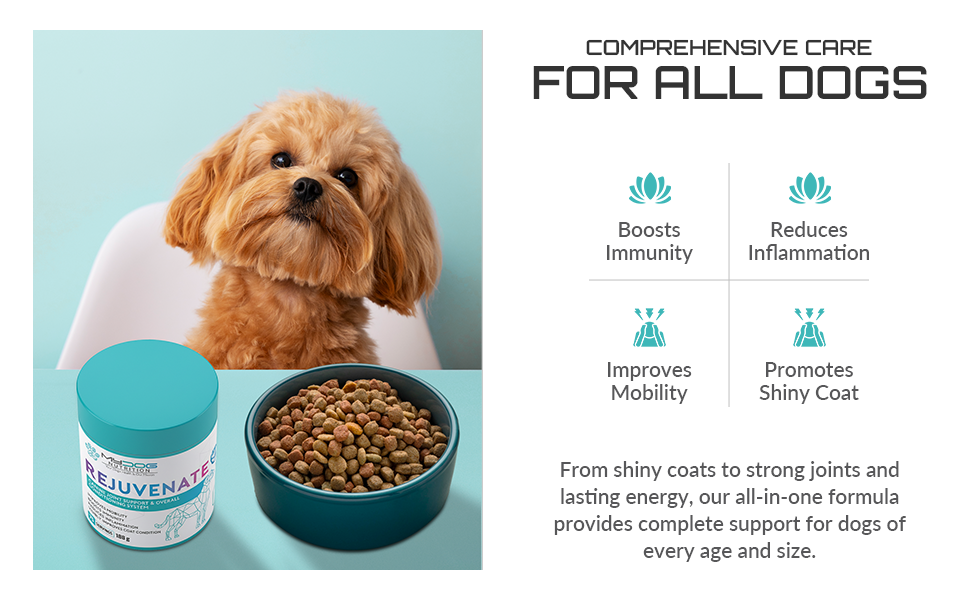Rejuvenate dog supplement blends clinically researched ingredients to nourish your dog’s joints, skin and gut. Made from human‑grade, non‑GMO ingredients, this formula contains no fillers or artificial flavours.