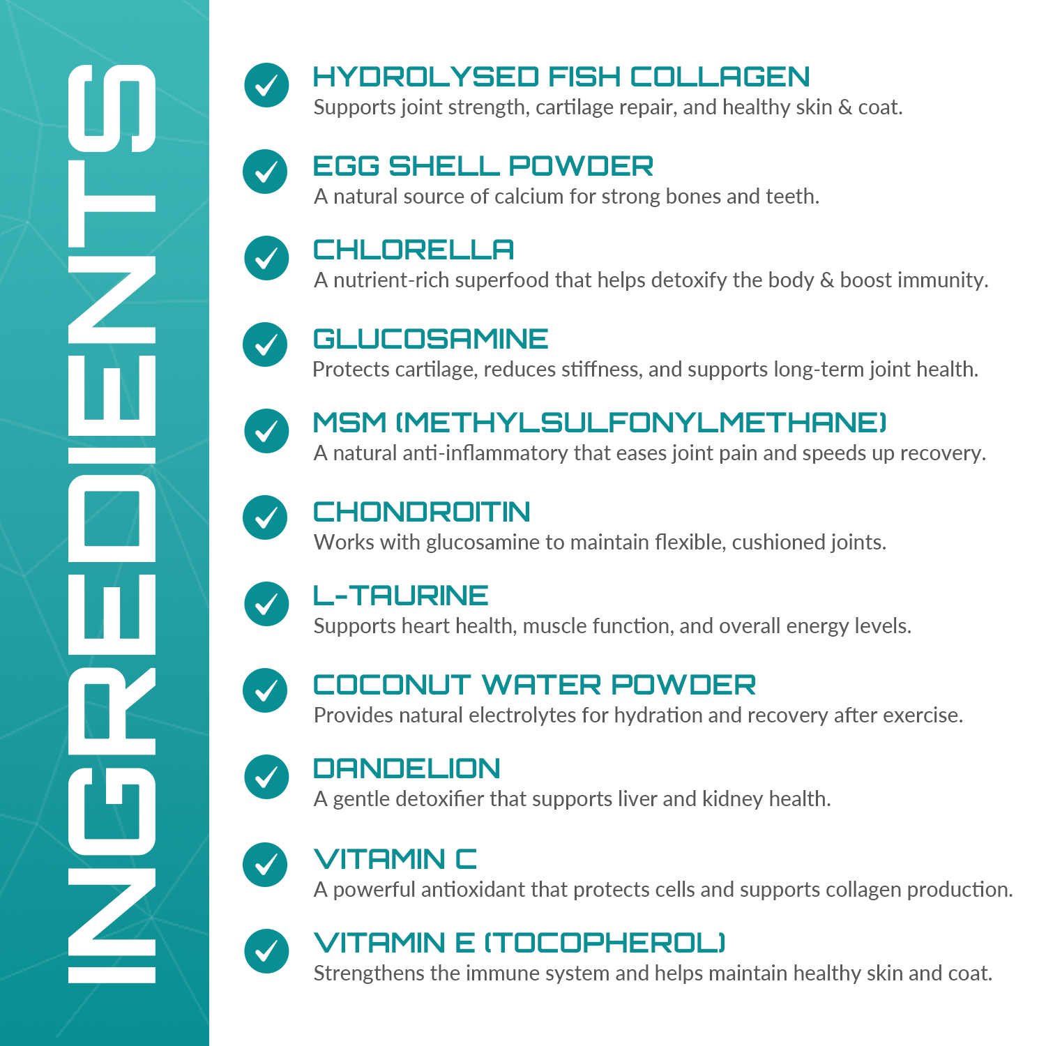 Marine Collagen & Egg Shell Powder – Provide amino acids and natural calcium to maintain healthy joints, bones, and skin.
